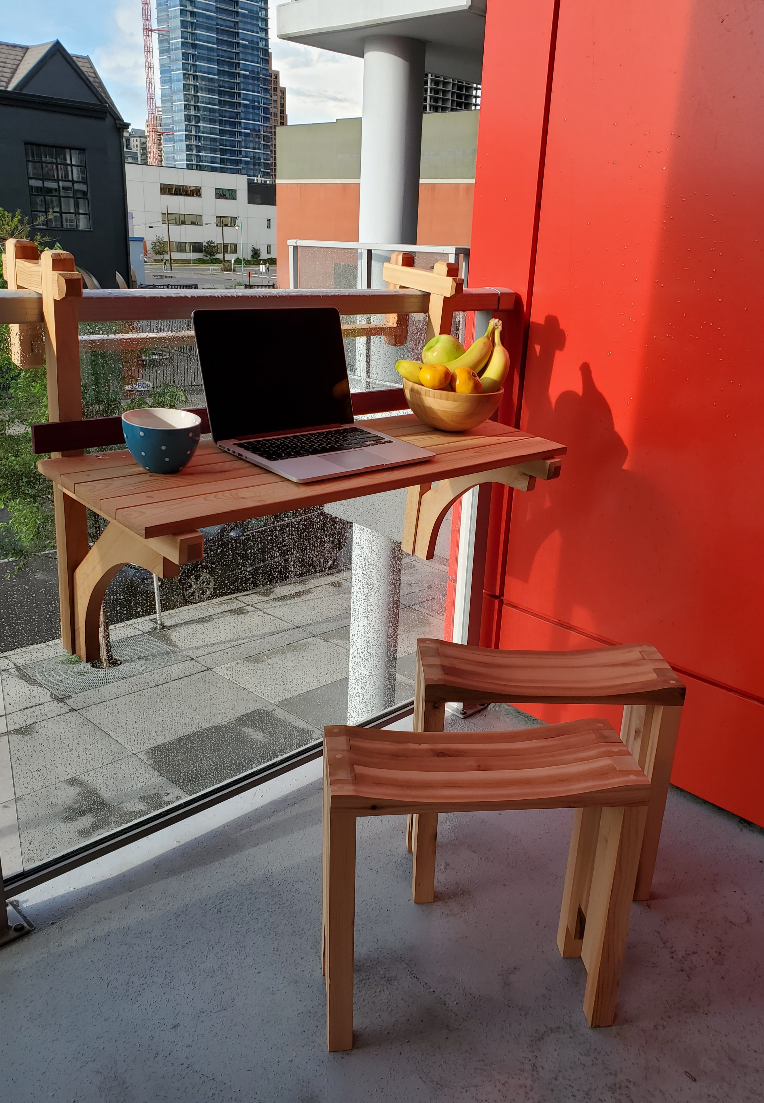 Our Kontemporary Kondo Balkony Set is made to order with hand milled Western Red Cedar. Papa "G" has created this unique, stylish and functional design to maximize work and dining space on urban balconies. This practical concept pairs beautifully to make the most of limited space on modern city balconies. The Kontempo Kondo Desk Top Table is available in 2', 3', 4' or 5' widths, the desk is custom built to the height and width of your balcony rail at no extra charge, assuring a secure and comfortable fit for every application. These items can be purchased together or separately.